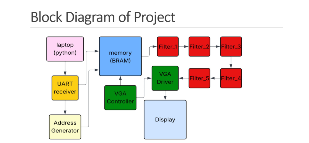 This project aims to develop a custom hardware-accelerated photo viewer and image processor that runs on an FPGA development board. It receives a digital image from a computer, stores it in the FPGA’s internal memory, applies selected image filters using hardware-based processing, and outputs the final result to a VGA monitor.